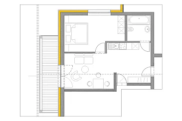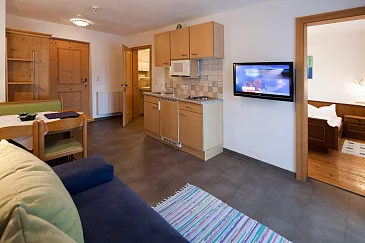 The suite consists of 1 bedroom, 1 bathroom, a living-room with couch/doublebed, a small kitchenette with corner seat, flatscreen TV